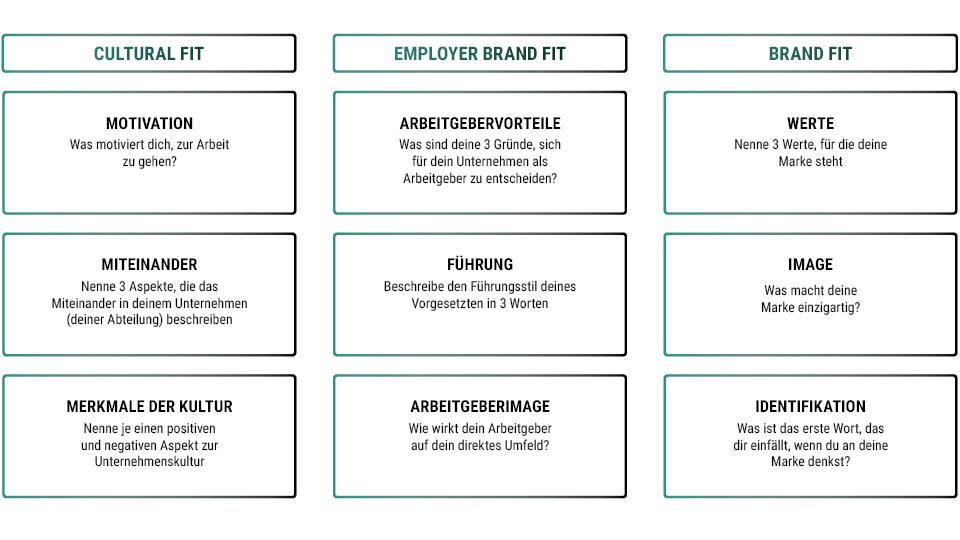 Mit der Culture-Matrix können wir in Zusammenarbeit mit den Mitarbeitern und den Führungskräften das Unternehmen in den Dimensionen Kultur, Arbeitgebermarke und Marke analysieren, um den aktuellen Zustand zu ermitteln. Dafür muss die Culture-Matrix jedoch zunächst individuell auf das Unternehmen zugeschnitten werden. Nach Abschluss dieser ersten Recherchephase erfolgt eine Befragung in Kategorien wie Motivation, Führungsstil und Image, die den Dimensionen Kultur, Arbeitgebermarke und Marke untergeordnet sind. Auf dieser Grundlage können wir Aussagen über verschiedene Aspekte der Unternehmenskultur treffen und Empfehlungen geben, um den Fit zwischen Arbeitnehmern und Arbeitgebern zu optimieren.